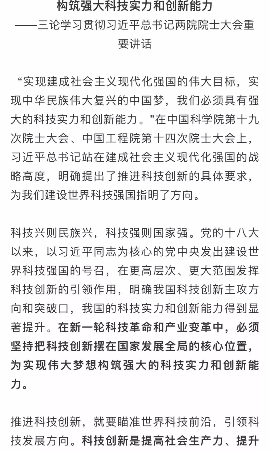 人民日報評論員:構筑強大科技實力和創新能力——三論學習貫徹習近平總書記兩院院士大會重要講話