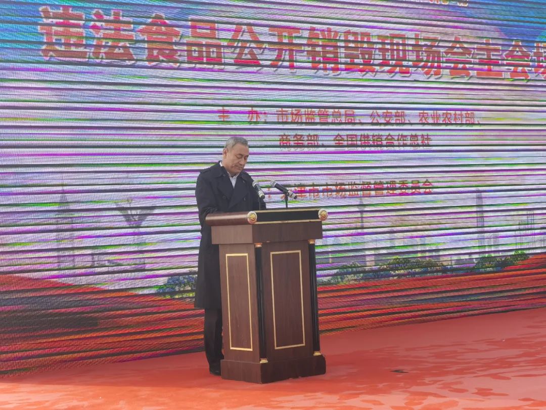 今日,由國家市場監管總局、公安部、農業農村部、商務部、中華全國供銷合作總社五部門聯合主辦的“農村假冒偽劣食品專項執法行動違法食品公開銷毀現場會”以視頻連線方式在北京召開,天津食品集團作為唯一一家企業代表受邀參加天津主會場會議,集團黨委副書記、總經理趙國榮出席并代表集團發言。