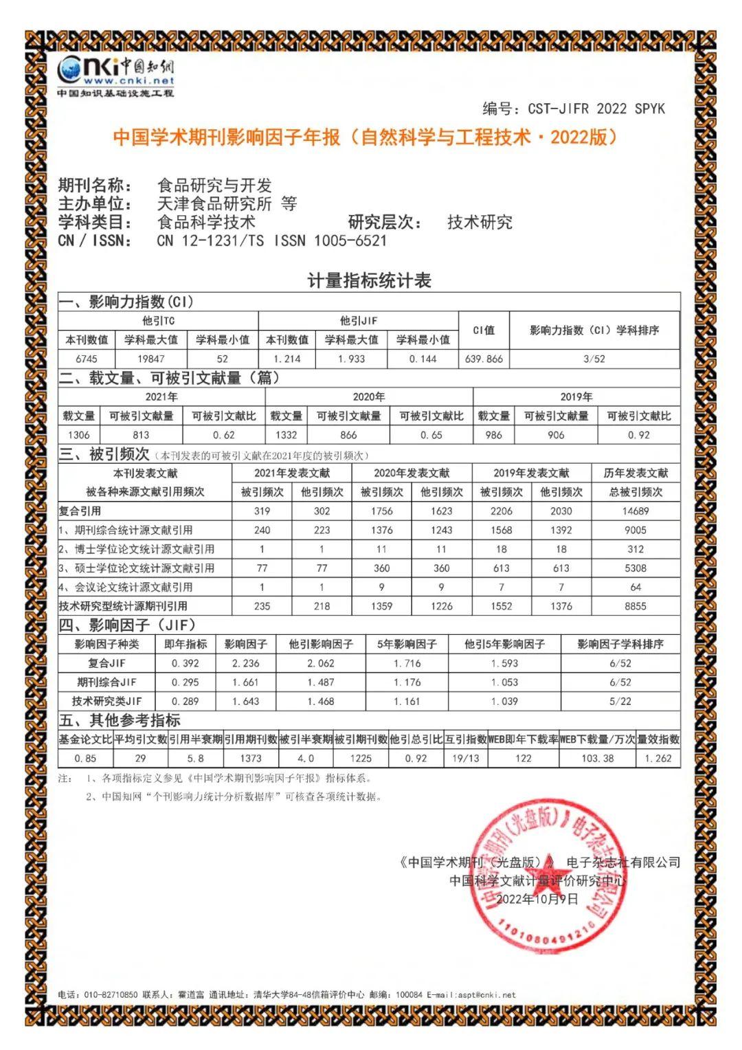 日前,中國學術期刊(光盤版)電子雜志社有限公司、中國科學文獻計量評價研究中心編制出版的《中國學術期刊影響因子年報(自然科學與工程技術·2022版)》正式發布。食品集團主管,天津市食品研究所主辦的期刊《食品研究與開發》的影響力指數穩居本學科第三位。
